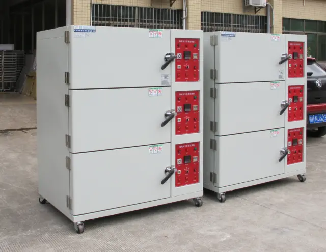 5.2锂电专用烘箱在常压下加热一段时间后电池或极片中的水分转化为水蒸气;水分蒸发后抽真空可以将水蒸气抽出;充氮气破真空,保持干燥环境。实际的烘烤过程中根据不同的工艺以上三个步骤先后各不相同,一般都要多次循环。